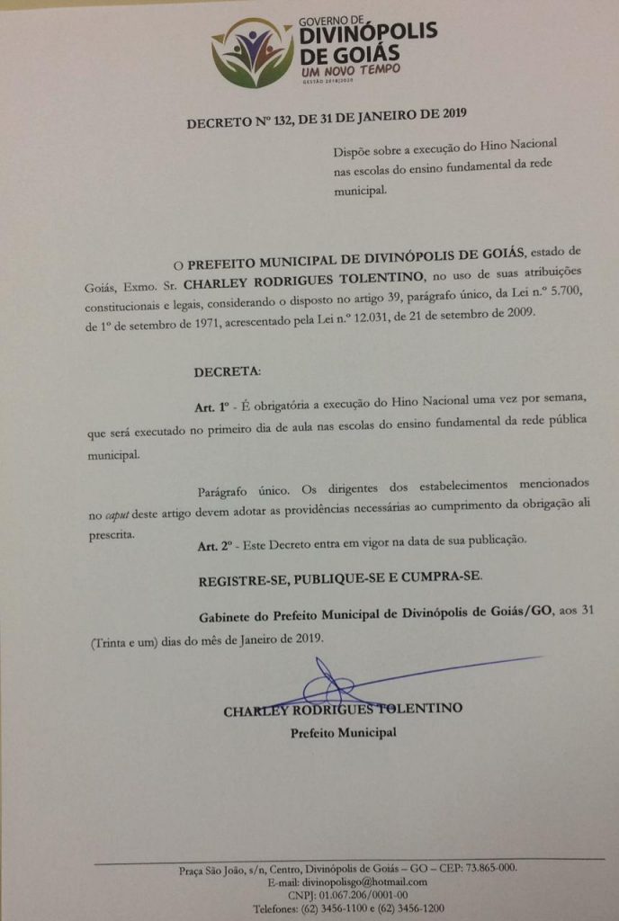 Divinópolis de Goiás resgata patriotismo nas escolas com execução de hino nacional. Por meio de um decreto, o prefeito de Divinópolis de Goiás, Charley Tolentino, determinou que a partir deste mês de fevereiro, todas as escolas de ensino fundamental da rede pública municipal executem o hino nacional uma vez por semana.