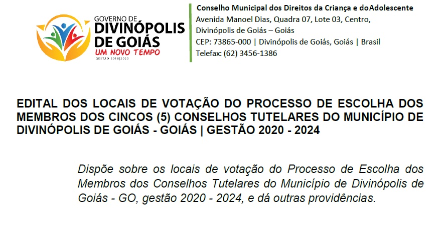 No dia 6 de outubro, no período entre 9h e 15h, sem intervalo, os cidadãos de Divinópolis de Goiás – GO, poderão escolher os cinco membros do Conselho Tutelar do Município, com mandato entre 10 de janeiro de 2020 e 9 de janeiro de 2024. 23 candidatos concorrem às vagas.