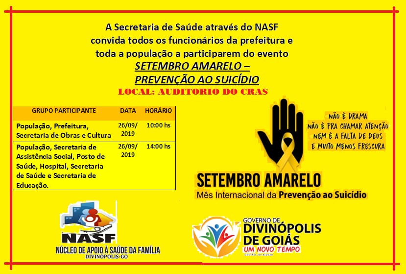 A Secretaria de Saúde, através do NASF, convida toda a população para participar do evento do Setembro Amarelo – Prevenção ao Suicídio, que ocorrerá nesta quinta-feira, dia 26 de setembro, as 10h e as 14h, escolha o horário de sua preferência.