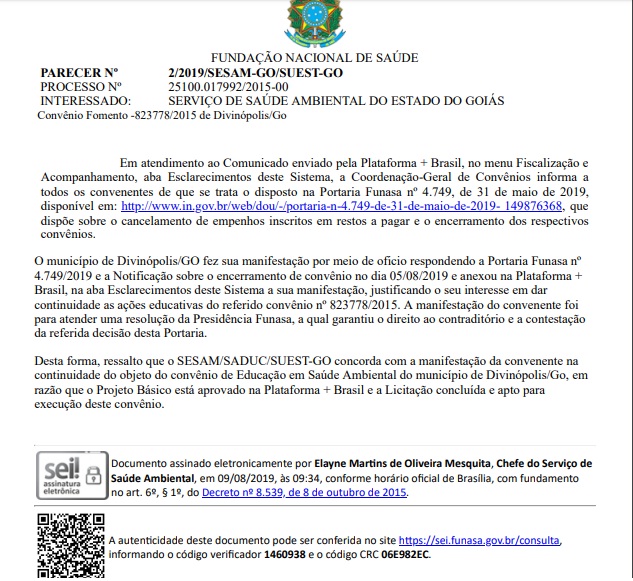 A Fundação Nacional de Saúde (Funasa) acatou a contestação do município de Divinópolis de Goiás e determinou a continuação de convênio que havia sido cancelado por portaria da presidência da república.