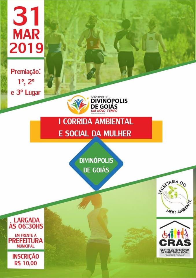 A Prefeitura Municipal de Divinópolis de Goiás em parceria com a Secretaria de Meio Ambiente e a Assistência Social informam que está chegando o grande dia da I Corrida Ambiental e Social da Mulher, em comemoração ao mês da mulher.