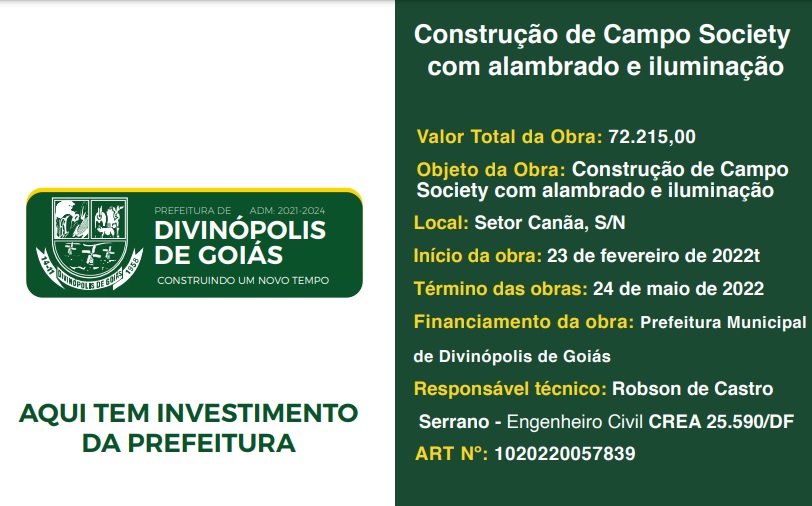 Financiamento da obra: Prefeitura Municipal de Divinópolis de Goiás