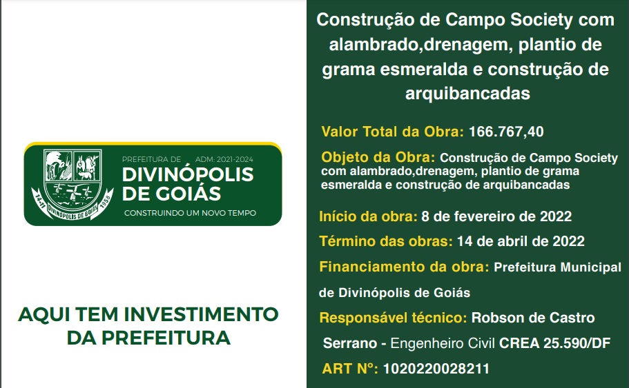 Objeto da Obra: Construção de Campo Society com alambrado,drenagem, plantio de grama esmeralda e construção de arquibancadas