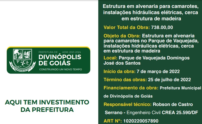 Financiamento da obra: Prefeitura Municipal de Divinópolis de Goiás