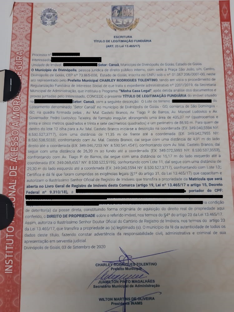 O sonho de ter um documento que comprove a propriedade definitiva da própria moradia será celebrado por 30 famílias na cidade de Divinópolis de Goiás, dentro do programa de regularização fundiária (Minha Casa Legal) lançado pela prefeitura municipal.