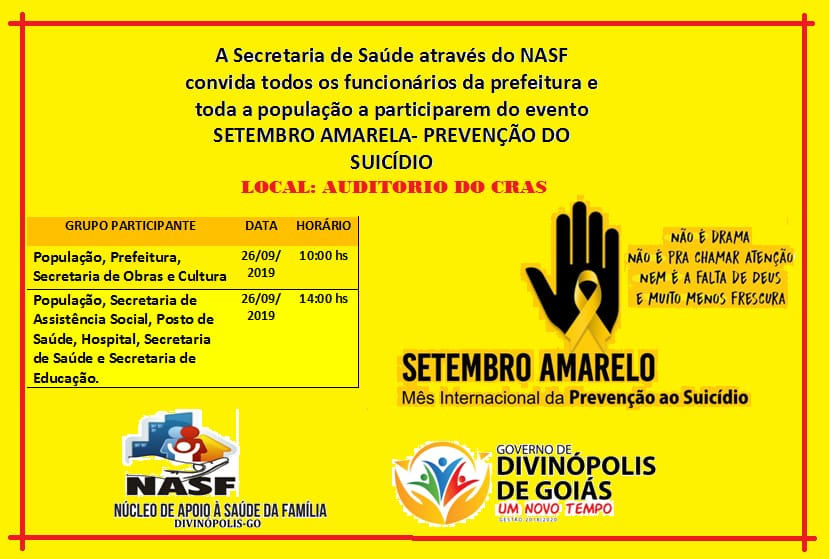 O mês de setembro é o setembro amarelo dedicado a prevenção do suicídio, nesse mês o NASF fará ações nas escolas de prevenção a auto mutilação e suicídio.